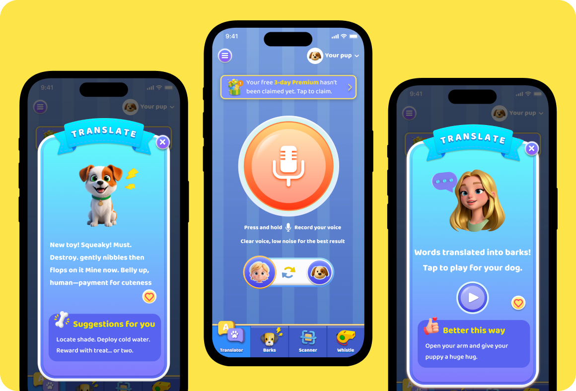 Ever wondered what your dog is thinking? Just record their bark, and BarkAI will instantly tell you what's on their mind! Plus, with our cool feature, your pup can finally understand you, too!